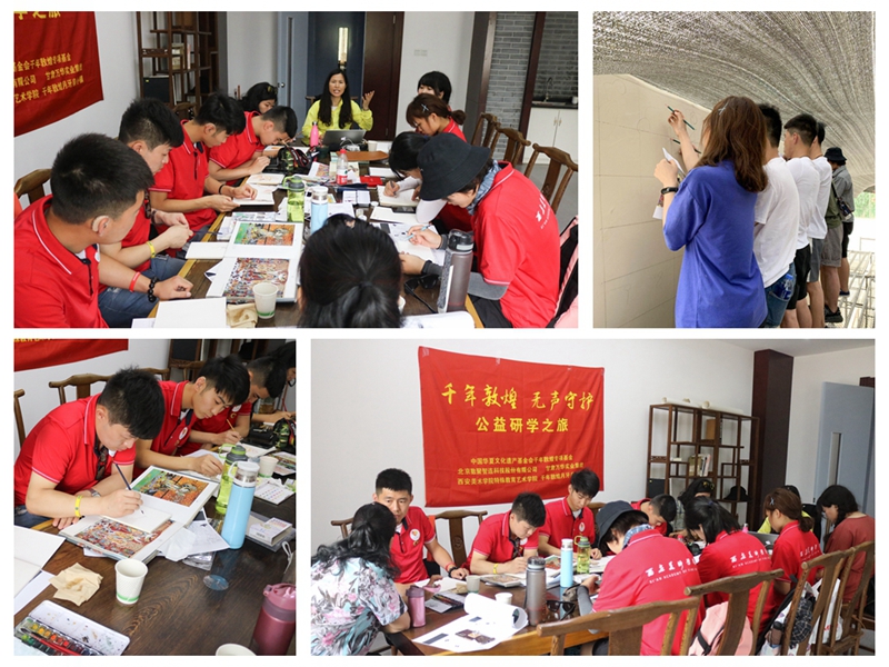 上午9时,学员们早早来到月牙泉小镇鸣沙书院内,根据22日参观学习莫高窟壁画所整理的资料,用手语探讨交流,并展开初步构思。在西美老师的细心指导下,他们很快沉醉在美妙的艺术世界里。