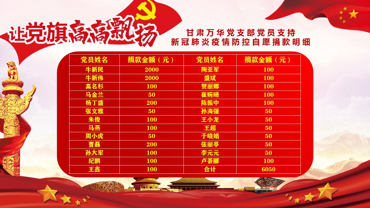 截止到当日17时,共有25名万华集团党支部党员、预备党员、入党积极分子自发地进行了捐款,捐款总额6050元。这笔捐款通过兰州市总商会党委统一捐至防疫工作最需要的第一线,主要用于慰问战斗在疫情防控斗争第一线的医务人员、基层干部群众、公安民警和社区工作者等,资助因患新冠肺炎而遇到生活困难的群众和因患新冠肺炎去世的群众家属,慰问在疫情防控斗争中牺牲的干部群众家属等。